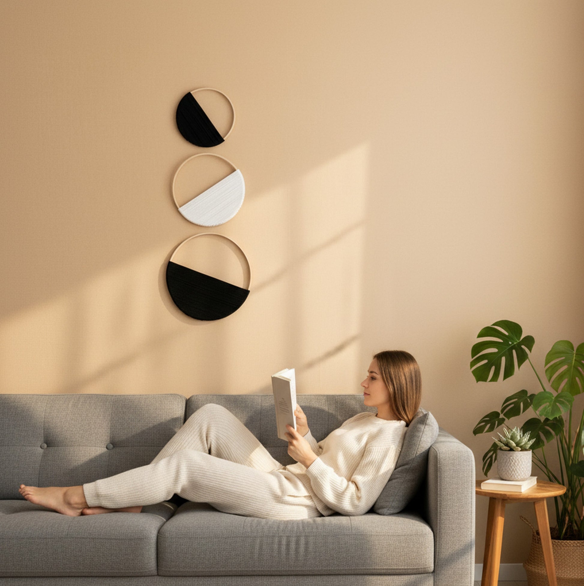 The Macrame Circle Wall Decor adds a sense of harmony and movement to your home. Designed with three geometric circles aligned vertically, this handmade macrame wall art combines modern balance with natural softness. Crafted from durable fibers in neutral tones, it fits beautifully in living rooms, bedrooms, or creative spaces. Ideal for those who love boho wall art or minimalist home wall decor, this piece also makes a thoughtful gift for birthdays or housewarmings. Bring texture, warmth, and contemporary charm into your home with this unique wall decor.