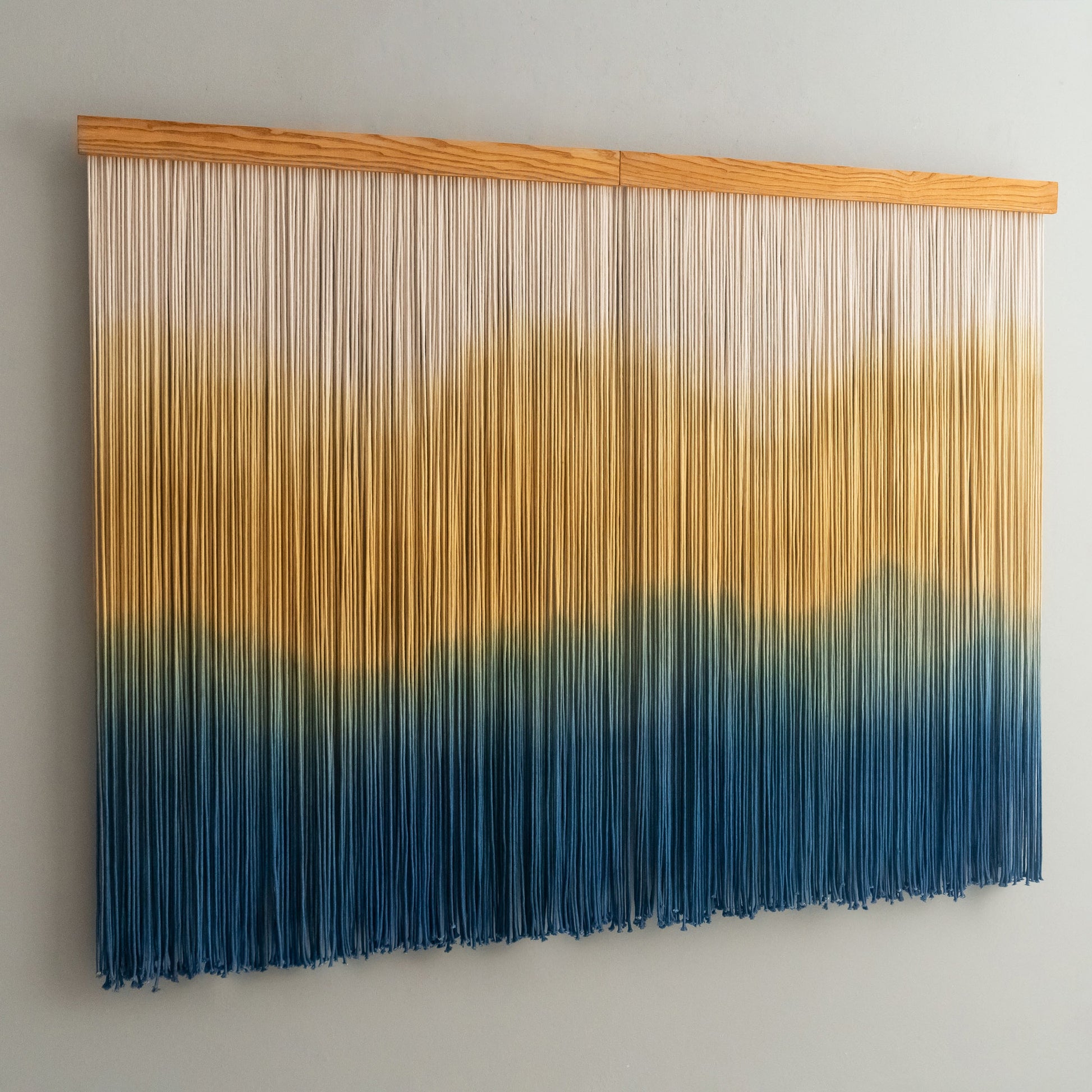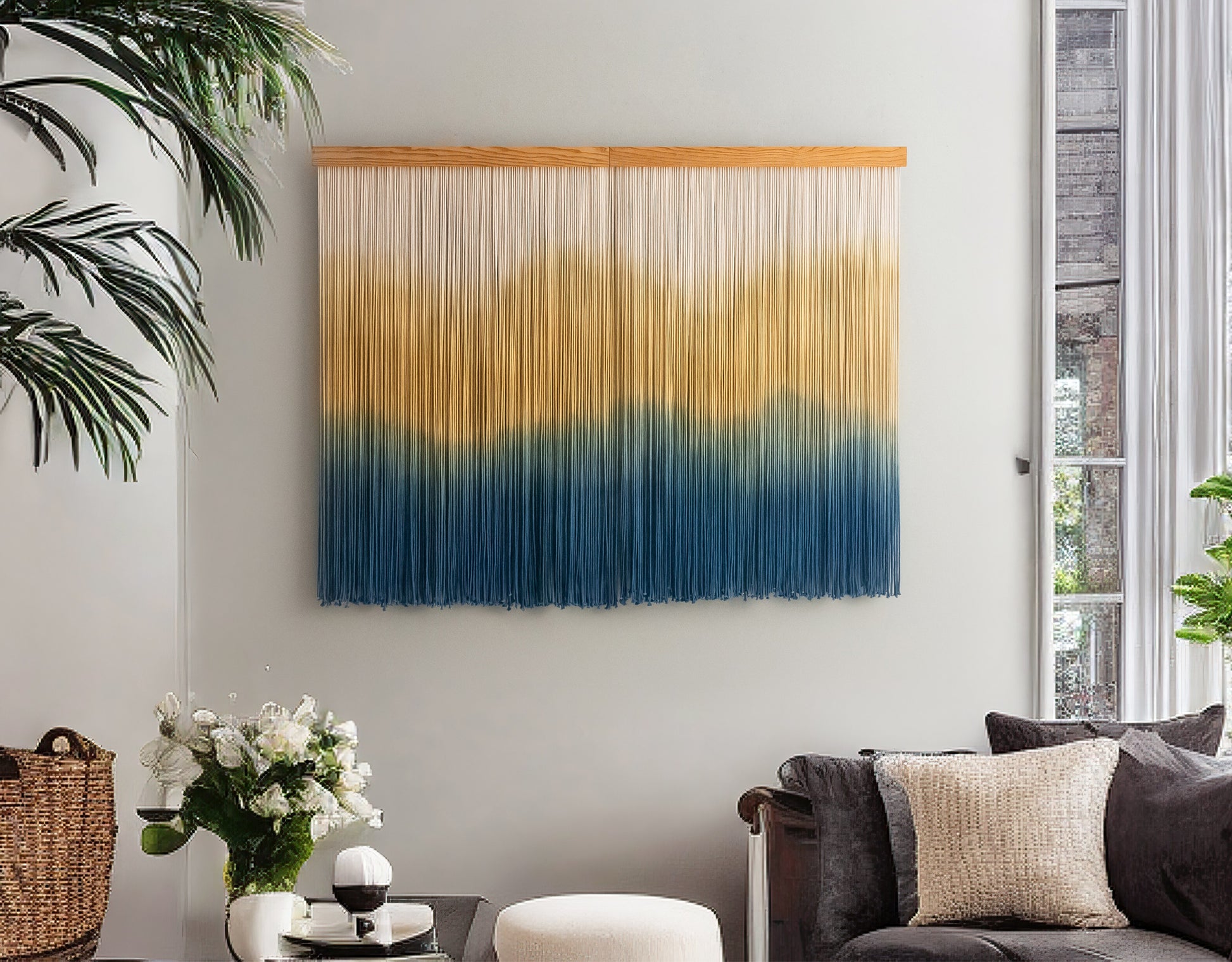 The Ocean Sunet macrame wall hanging captures the peaceful rhythm of shifting colors, blending warm gold and deep ocean tones to create a soothing atmosphere in your home. Handmade with flowing fibers and a minimalist silhouette, this piece adds texture and depth to any blank wall while bringing a sense of calm to your living space. Ideal for those who love boho wall art or neutral wall decor, it enhances living rooms, bedrooms, offices, and nurseries with its gentle gradient. As a thoughtful housewarming or birthday gift, this large wall hanging offers an artistic and modern touch that transforms your interior with ease and harmony.